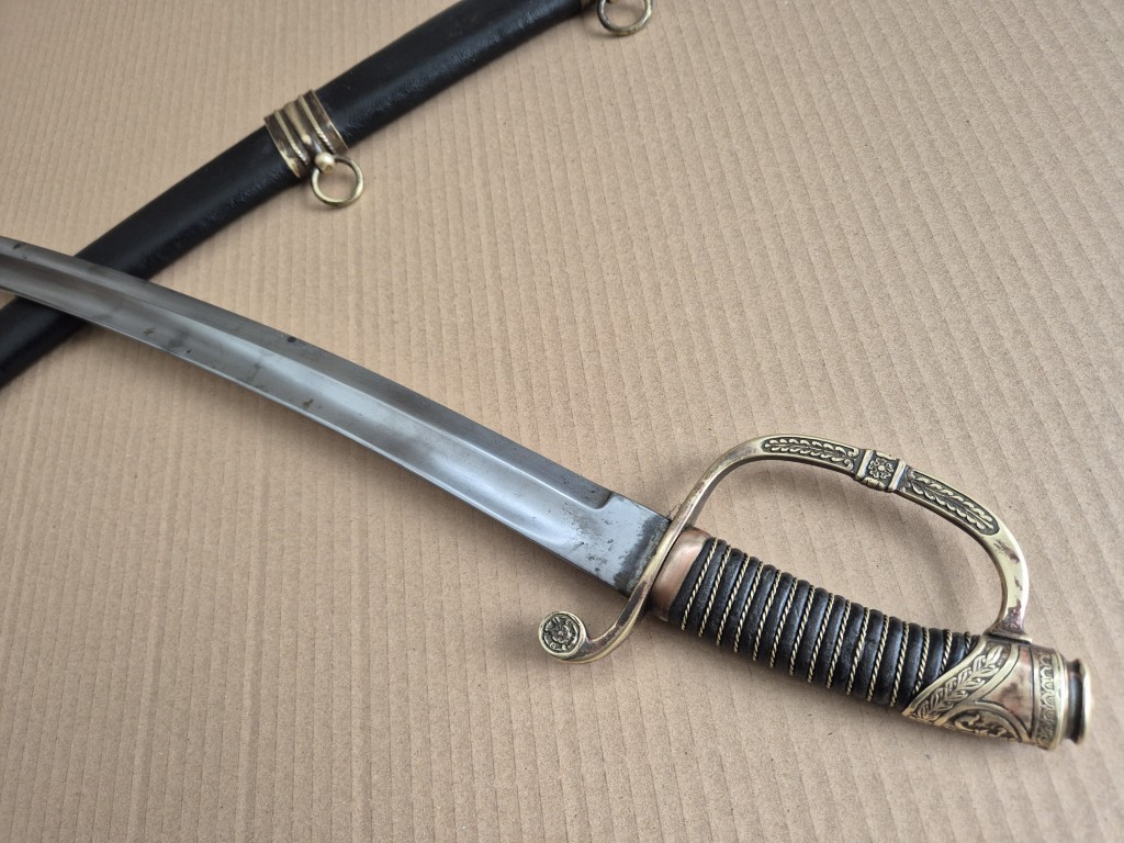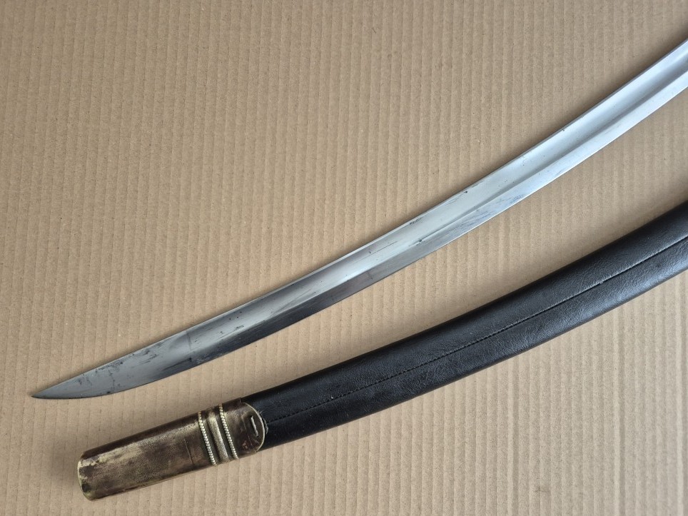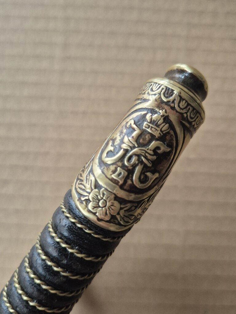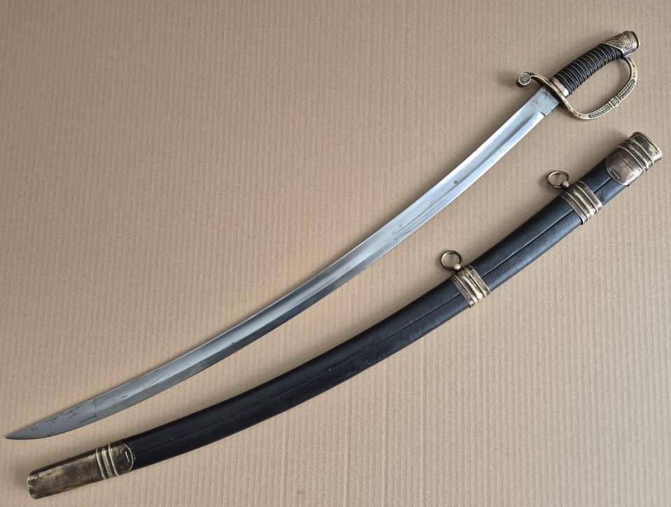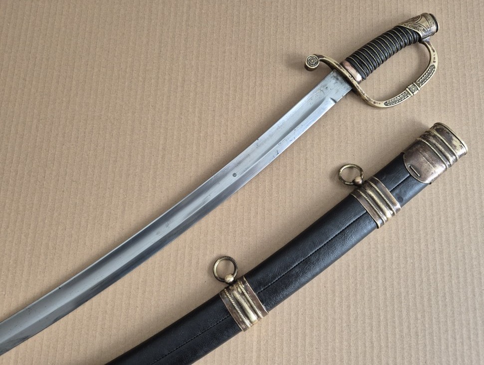 Монограм на Император Николай II на бронзовият гард на дръжката. Перфектно запазено остие. Запазена кания и кожа. Обща дължина - 103 см. Дължина само на острието - 83 см. Дължина само на сабята - 98 см. Запазена кания и кожа.