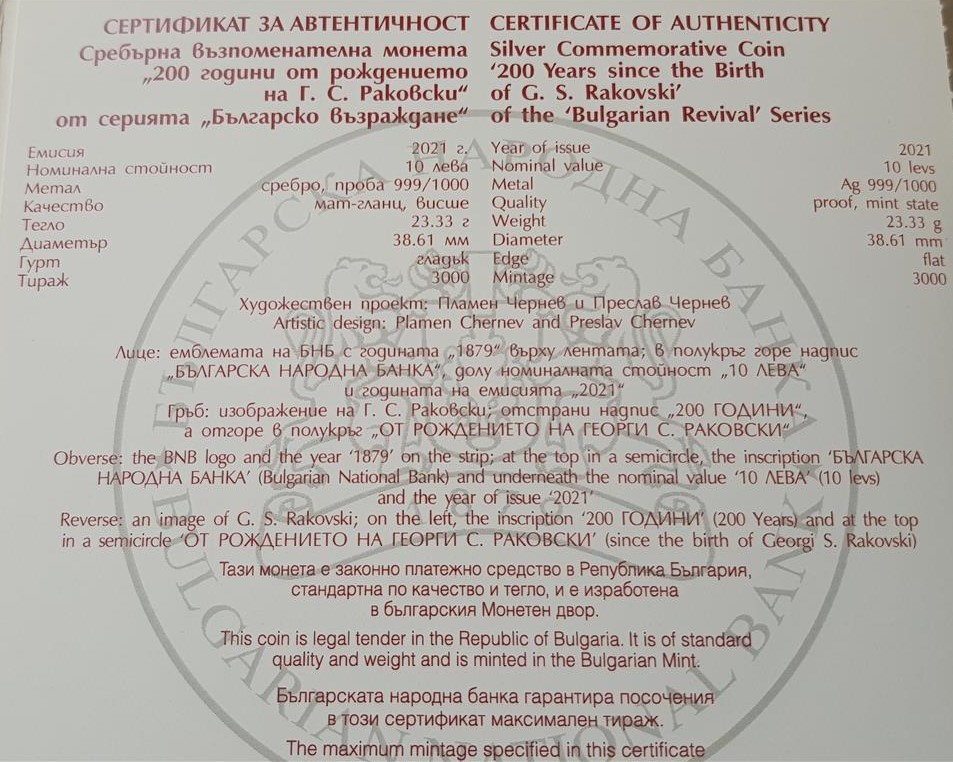 Начало / Антиквариат / 10 лева 2021 година 200 г. от рождението ГЕОРГИ С. РАКОВСКИ
