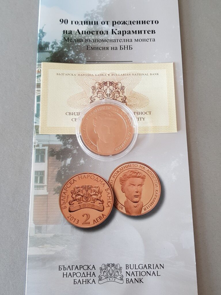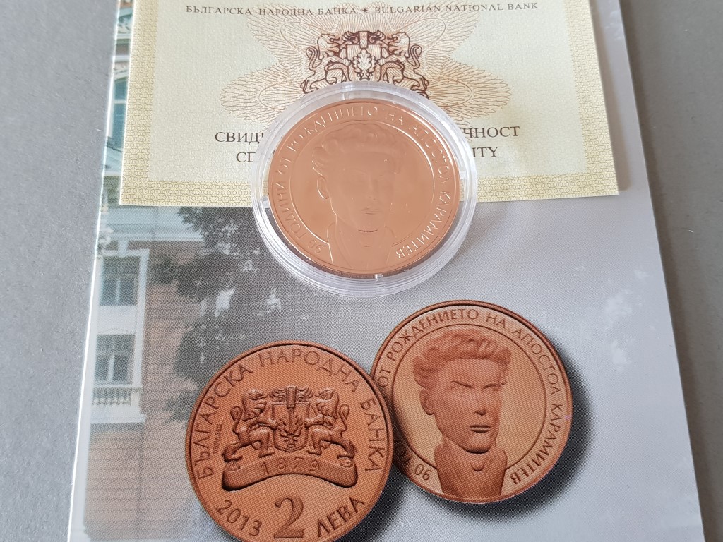 Начало / Антиквариат / 2 лева 2013 година 90 г. от рождението на Апостол Карамитев